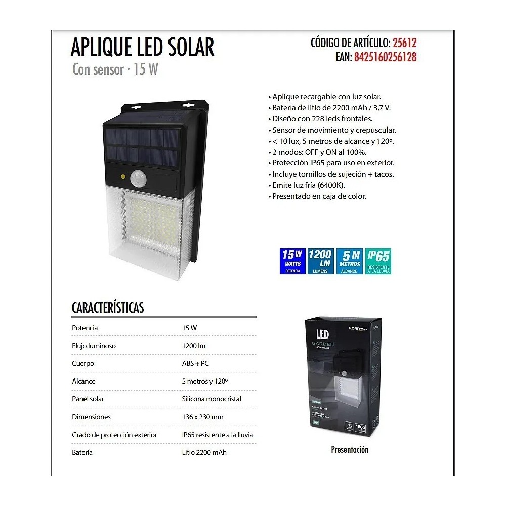 Aplique LED recargable con luz solar. Batería de litio de 2200 mAh / 3,7 V. Diseño con 228 leds frontales. Sensor de movimiento y crepuscular. < 10 lux, 5 metros de alcance y 120º. 2 modos: OFF y ON al 100%. Protección IP65 para uso en exterior. Incluye tornillos de sujeción + tacos. Emite luz fría (6400K). Presentado en caja de color.