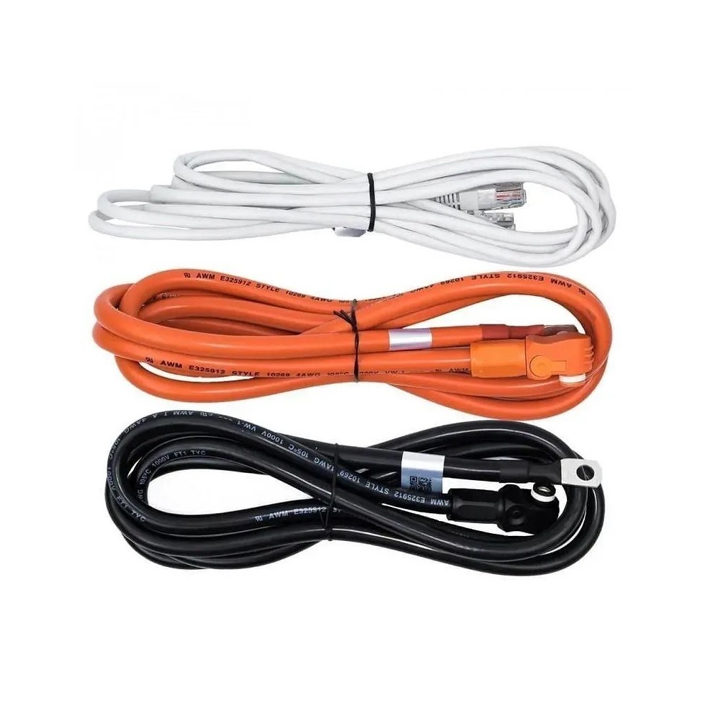 Juego de cables para baterías de litio pylontech US2000, US3000, UP2500. Los cables pylontech llevan un terminal de 25-10 en un extremo y en el otro los conectores específicos de zafado rápido que utilizan las baterías pylontech. Además se incluye un cable de comunicación por puerto can bus.( Para determinados inversores).