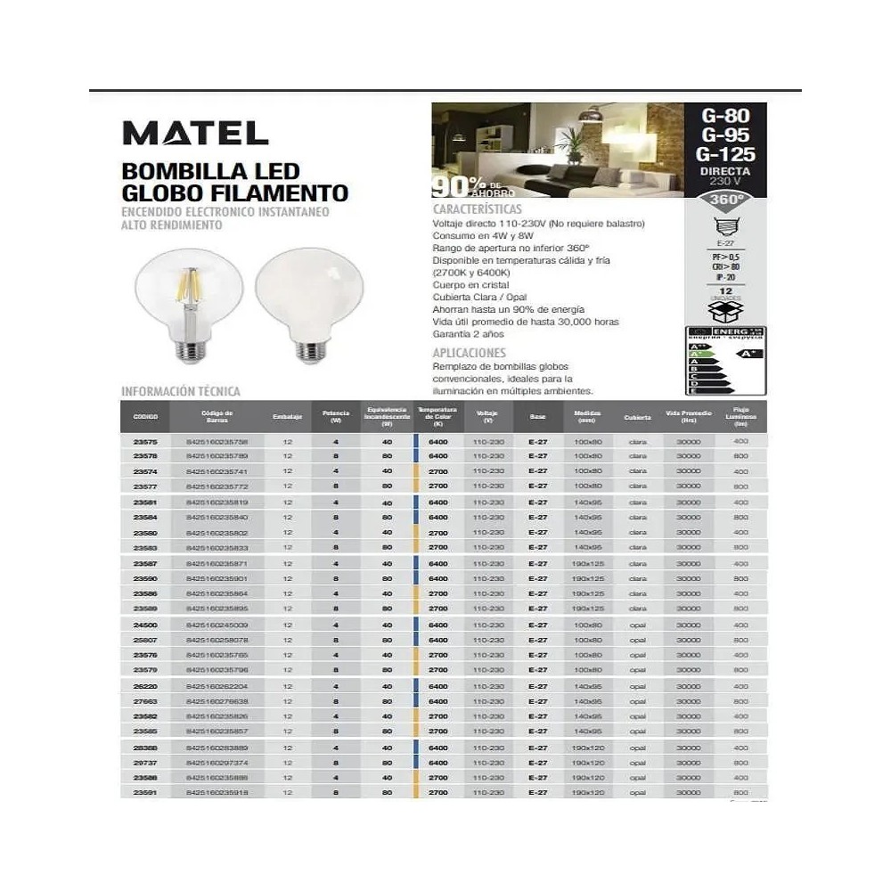 Bombilla LED Matel filamento globo G125 clara E27 de 8W, disponible en temperatura fría y cálida. Reemplazo de bombillas globos convencionales, ideales para la iluminación en múltiples ambientes.