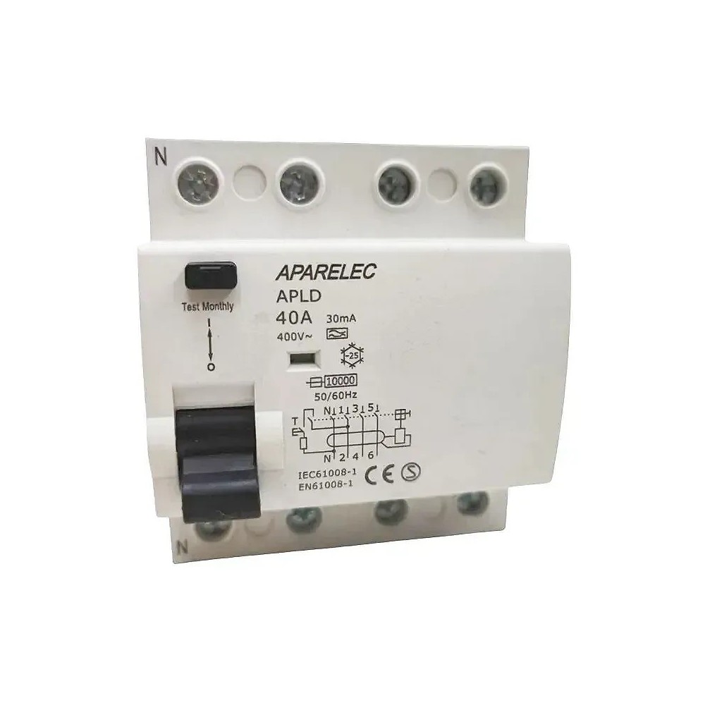 Diferencial Inmunizado 4 Polos 40A 30mA clase A de Aparelec, detecta corrientes de fuga alternas y continuas.