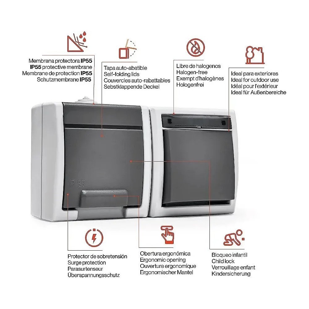 Como indica su grado de protección IP55 se encuentra protegido contra el polvo y los chorros de agua, fabricado en materiales libres de halógenos, además de su alta resistencia mecánica, al fuego y la capacidad de no propagar incendios. Preparado para ser instalado en tubo rígido, conductores o canales.