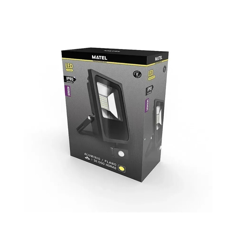 Proyector LED con sensor negro Matel de 20W IP65, disponible en temperatura cálida. Proyectores aptos para exterior, ideales para la iluminación en múltiples ambientes.