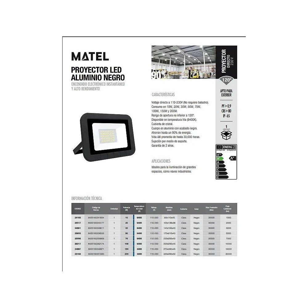Proyector LED Matel plano negro de 10W, disponible en temperatura fría y cálida. Proyectores aptos para exterior Ideales para la iluminación de grandes espacios, como naves industriales.