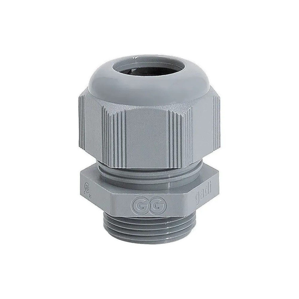 Prensaestopas PM40 de poliamida gris oscuro. Incluye contratuerca y junta negra de neopreno fabricado en poliamida.